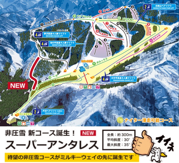 神立高原是盆地的地形,纜車從中間往四處散開,最後都會滑回正中央;從入口處搭乘纜車 ( 圖左下 2 人纜車 ) 越過一段綠線樹林區後,一眼望去將會看到神立最主要的寬廣雪道,再搭乘另一台纜車 ( 圖中下 4 人纜車 ) 往上爬升時,左側是初中級適合的綠線雪道,而右側則是高手聚集的park區 ( 圖中 12 號雪道 ) ,坐在纜車上欣賞高手們的表演,是坐這條纜車的樂趣之一。