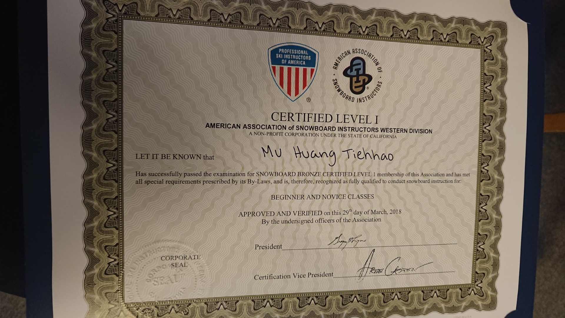 2018年取得了美國雪協(Professional Ski Instructors of America - American Association of Snowboard Instructors)AASI LV1 snowboard教練執照